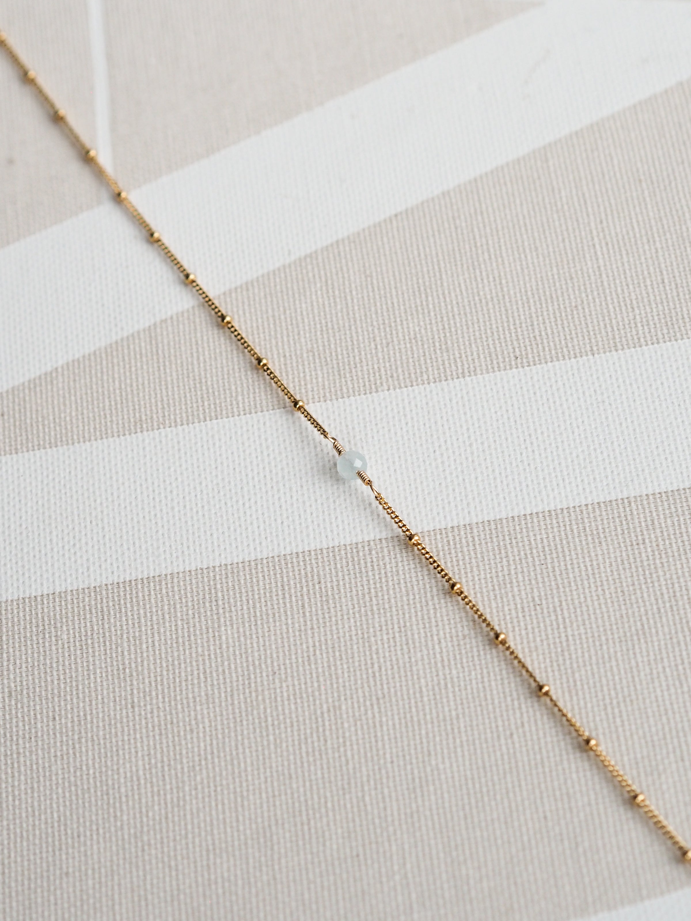 This elegant necklace features a genuine aquamarine gemstone – the birthstone for March, symbolising serenity, strength and clarity. Crafted from 18ct gold-plated recycled sterling silver, the delicate satellite chain and soft blue gemstone make it a timeless and meaningful piece.